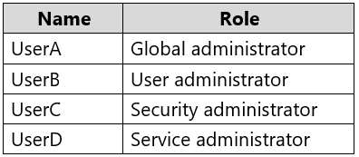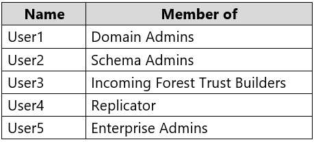 Box 1: User5In Express settings, the installation wizard asks for the following:AD DS Enterprise Administrator credentials Azure AD Global Administrator credentials The AD DS Enterprise Admin account is used to configure your on-premises Active Directory. These credentials are only used during the installation and are not used after the installation has completed. The Enterprise Admin, not the Domain Admin should make sure the permissions in Active Directory can be set in all domains. Box 2: UserAAzure AD Global Admin credentials are only used during the installation and are not used after the installation has completed. It is used to create the Azure AD Connector account used for synchronizing changes to Azure AD. The account also enables sync as a feature in Azure AD. Reference:https://docs.microsoft.com/en-us/azure/active-directory/connect/active-directory-aadconnect-accounts-permissions