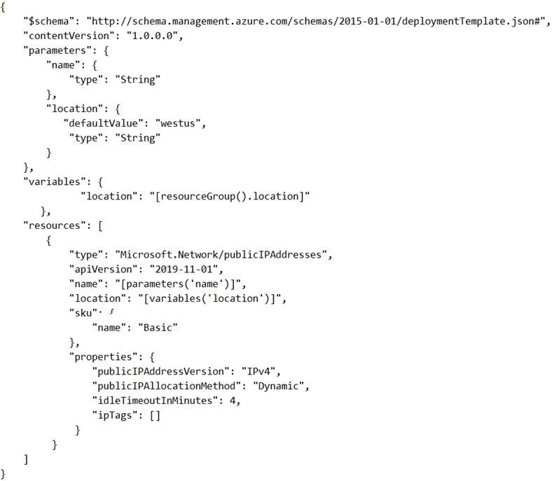 You create an Azure Resource Manager template named Template1 as shown in the following exhibit.