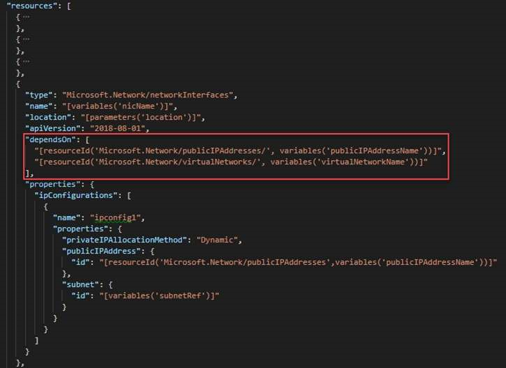The dependsOn element enables you to define one resource as a dependent on one or more resources. The resource depends on two other resources: