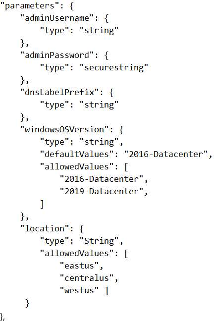 You have an Azure Resource Manager template for a virtual machine named Template1. Template1 has the following parameters section.