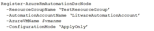 Change the ConfigurationMode parameter from ApplyOnly to ApplyAndAutocorrect.   The Register-AzureRmAutomationDscNode cmdlet registers an Azure virtual machine as an APS Desired State Configuration (DSC) node in an Azure Automation account.  Scenario: Current Technical Issue The test servers are configured correctly when first deployed, but they experience configuration drift over time.   Azure Automation State Configuration fails to correct the configurations.   Azure Automation State Configuration nodes are registered by using the following command.     Regis ter-AzureRmAu toma tionDs cNode  ResourceGroupName 'TestResourceGroup'  AutomationAccountName 'LitwareAutomationAccount'  AzureVMName $vmanme  Conf igurationMode 'ApplyOnly'    References: https://docs.microsoft.com/en-us/powershell/module/azurerm.automation/register-azurermautomationdscnode?view=azurermps-6.13.0