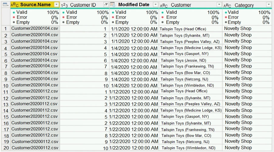 You have a query named Customer that imports CSV files from a data lake. The query contains 50,000 rows as shown in the exhibit. (Click the Exhibit tab.)