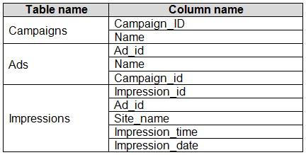 • Present ad impression counts for the day, campaign, and Site_name. The analytics for the last year are required.