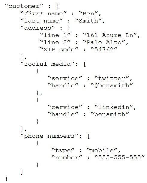 Use the drop-down menus to select the answer choice that completes each statement based on the information presented in the JSON document.