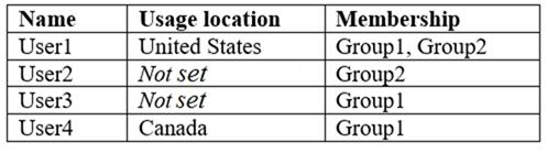 Group-based licensing currently does not support groups that contain other groups (nested groups). If you apply a license to a nested group, only the immediate first-level user members of the group have the licenses applied.  Therefore, User2 will not be assigned a license. When Azure AD assigns group licenses, any users without a specified usage location inherit the location of the directory.  Therefore, User3 will be assigned a license and his usage location will be set to the location of the directory. Reference:https://docs.microsoft.com/en-us/azure/active-directory/users-groups-roles/licensing-groups-assignhttps://docs.microsoft.com/en-us/azure/active-directory/users-groups-roles/licensing-group-advanced