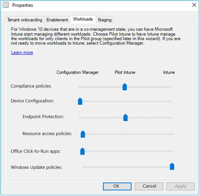 You configure co-management workloads as shown in the following exhibit.