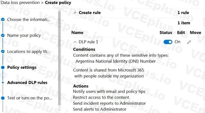 Reference:https://docs.microsoft.com/en-us/microsoft-365/compliance/create-a-dlp-policy-from-a-template?view=o365-worldwide