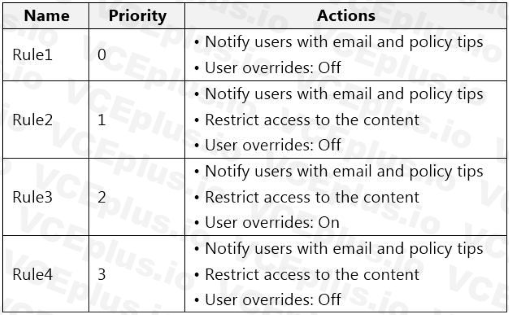 You have a data loss prevention (DLP) policy that has the advanced DLP rules shown in the following table.