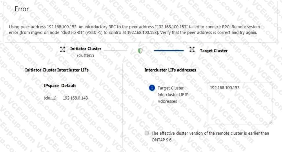 Cluster2 intercluster LIF IP: 192.168.0.143 Subnet: 255.255.255.0 Port: e0e passphrase: netapp1234 Cluster1 intercluster LIF IP: 192.168.0.153 Subnet: 255.255.255.0 Port: e0e passphrase: netapp1234 Referring to the exhibit, which statement is correct?