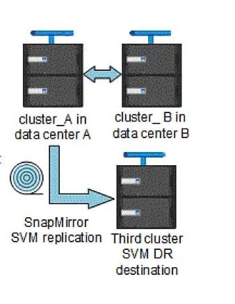 Using ONTAP 9.5, you are operating with data protection across three sites. The cluster_A and cluster_B systems require synchronous replication. The SVMs on cluster_A also require asynchronous SVM-DR replication to a third site. All replication between all sites must also replicate the SVM configuration.