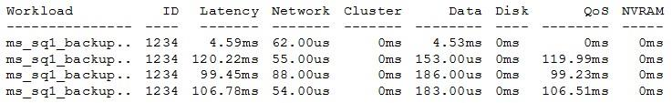 A backup administrator notices throughput problems during backup jobs. While the job is running, you review the QoS output for the target volume.