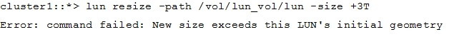 While expanding a 200 GB LUN in an ONTAP 9.4 system, the following error is observed: