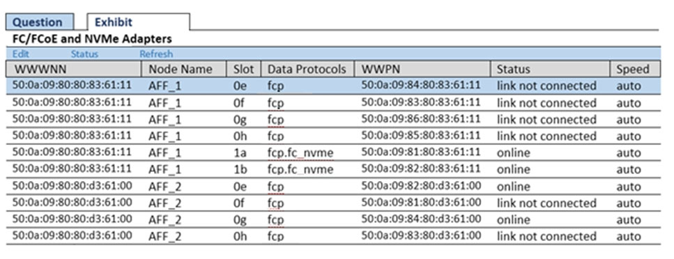 Referring to the exhibit, which two pairs of ports are currently configurable as FC SAN LIFs? (Choose two.)