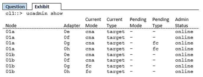 Referring to the exhibit, which two pairs of ports are currently configurable as FC SAN LIFs? (Choose two.)