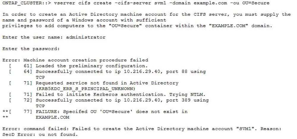 The storage administrator for the company example.com is attempting to join an SVM to their Active Directory as SVM1. The computer account must also be joined to the Secure organizational unit. Attempts to perform this action using the CLI fail with the error message shown in the exhibit.