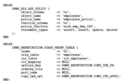 Examine the following commands for redefining a table with Virtual Private Database (VPD) policies: