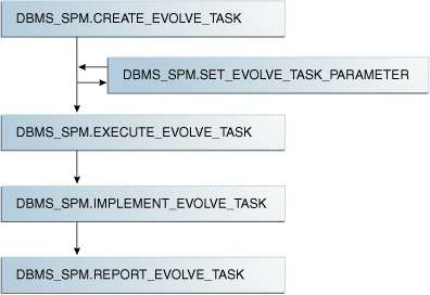 * Evolving SQL Plan Baselines   2. Create the evolve task by using the DBMS_SPM.CREATE_EVOLVE_TASK function. This function creates an advisor task to prepare the plan evolution of one or more plans for a specified SQL statement. The input parameters can be a SQL handle, plan name or a list of plan names, time limit, task name, and description. 1. Set the evolve task parameters. SET_EVOLVE_TASK_PARAMETER This function updates the value of an evolve task parameter. In this release, the only valid parameter is TIME_LIMIT. 4. Execute the evolve task by using the DBMS_SPM.EXECUTE_EVOLVE_TASK function. This function executes an evolution task. The input parameters can be the task name, execution name, and execution description. If not specified, the advisor generates the name, which is returned by the function. 3: IMPLEMENT_EVOLVE_TASKThis function implements all recommendations for an evolve task. Essentially, this function is equivalent to using ACCEPT_SQL_PLAN_BASELINE for all recommended plans. Input parameters include task name, plan name, owner name, and execution name. 5. Report the task outcome by using the DBMS_SPM_EVOLVE_TASK function. This function displays the results of an evolve task as a CLOB. Input parameters include the task name and section of the report to include.