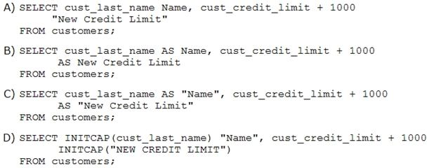 You need to produce a report where each customer's credit limit has been incremented by $1000. In the output, the customer's last name should have the heading Name and the incremented credit limit should be labeled New credit Limit. The column headings should have only the first letter of each word in uppercase.