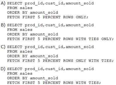You want to display 5 percent of the rows from the sales table for products with the lowest AMOUNT_SOLD and also want to include the rows that have the same AMOUNT_SOLD even if this causes the output to exceed 5 percent of the rows.
