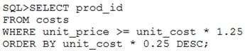 You need to generate a report that displays the IDs of all products in the costs table whose unit price is at least 25% more than the unit cost. The details should be displayed in the descending order of 25% of the unit cost.