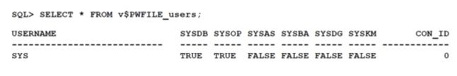 * orapwd / You can create a database password file using the password file creation utility, ORAPWD. The syntax of the ORAPWD command is as follows:orapwd FILE=filename [ENTRIES=numusers] [FORCE={y|n}] [ASM={y|n}] [DBUNIQUENAME=dbname] [FORMAT={12|legacy}] [SYSBACKUP={y|n}] [SYSDG={y|n}] [SYSKM={y|n}] [DELETE={y|n}] [INPUT_FILE=input-fname] force - whether to overwrite existing file (optional), * v$PWFILE_users / 12c: V$PWFILE_USERS lists all users in the password file, and indicates whether the user has been granted the SYSDBA, SYSOPER, SYSASM, SYSBACKUP, SYSDG, and SYSKM privileges./ 10c: sts users who have been granted SYSDBA and SYSOPER privileges as derived from the password file.ColumnDatatypeDescription USERNAMEVARCHAR2(30)The name of the user that is contained in the password file SYSDBAVARCHAR2(5)If TRUE, the user can connect with SYSDBA privileges SYSOPERVARCHAR2(5)If TRUE, the user can connect with SYSOPER privileges Incorrect:not E: The format of the v$PWFILE_users file is already in 12c format.