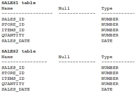 Sales data of a company is stored in two tables, SALES1 and SALES2, with some data being duplicated across the tables. You want to display the results from the SALES1 table, which are not present in the SALES2 table.