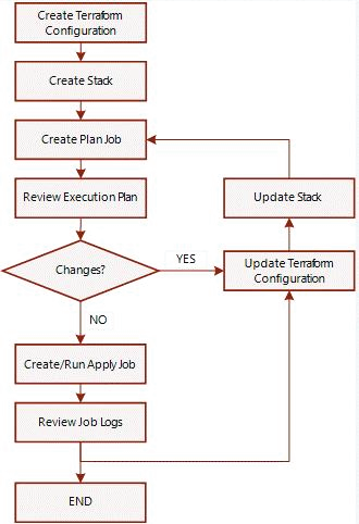 Resource Manager is an Oracle Cloud Infrastructure service that allows you to automate the process of provisioning your Oracle Cloud Infrastructure resources. Using Terraform, Resource Manager helps you install, configure, and manage resources through the "infrastructure-as-code" model. A Terraform configuration codifies your infrastructure in declarative configuration files. Resource Manager allows you to share and manage infrastructure configurations and state files across multiple teams and platforms. This infrastructure management can't be done with local Terraform installations and Oracle Terraform modules alone. JOB: Instructions to perform the actions defined in your configuration. Only one job at a time can run on a given stack; further, you can have only one set of Oracle Cloud Infrastructure resources on a given stack. To provision a different set of resources, you must create a separate stack and use a different configuration. The following image represents a generalized view of the Resource Manager workflow.