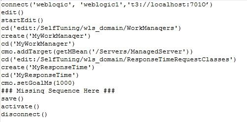 You want to create a WebLogic Server (WLS) Work Manager with a Response Time Request Class of one second. You start to create the following WLST script: