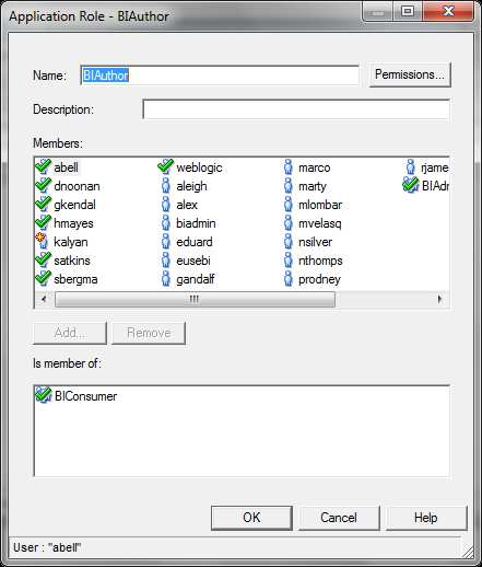 1. Security Manager, Query tab, Application role dialog box, Permissions