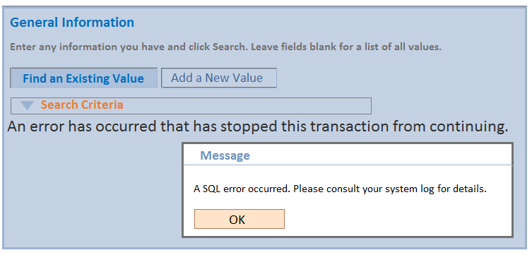 You click a value on the search page and get a SQL error as shown in this exhibit.