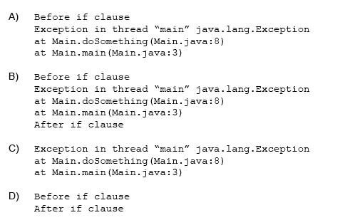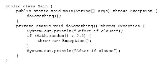 The first println statement,  System.out.println("Before if clause");, will always run. If Math.Random() > 0.5 then there is an exception. The exception message is displayed and the program terminates. If Math.Random() > 0.5 is false, then the second println statement runs as well. Incorrect answers:B: The second println statement would not run.C: The first println statement will always run.