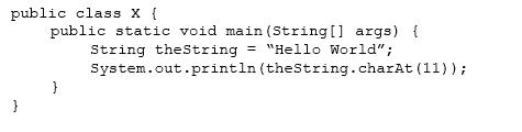 There are only 11 characters in the string "Hello World". The code the String.charAt(11) retrieves the 12th character, which does not exist. A StringIndexOutOfBoundsException is thrown. Exception in thread "main" java.lang.StringIndexOutOfBoundsException: String index out of range: 11