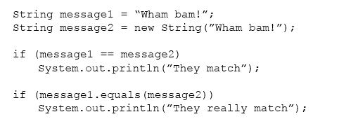 The equals method compares values for equality. Incorrect answers:The strings are not the same objects so the == comparison fails. See note #1 below. As the value of the strings are the same equals is true. The equals compares values for equality. There is no generic comparison method named same. = = (with a space) is not a valid method. Note: #1 ==Compares references, not values. The use of == with object references is generally limited to the following:Comparing to see if a reference is null. Comparing two enum values. This works because there is only one object for each enum constant. You want to know if two references are to the same object.