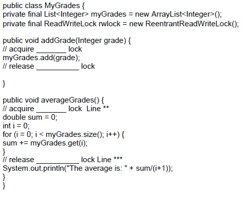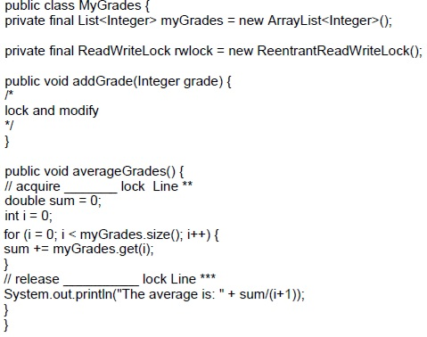 Which pair's statements should you insert at line ** and line *** (respectively) to acquire and release the most appropriate lock?
