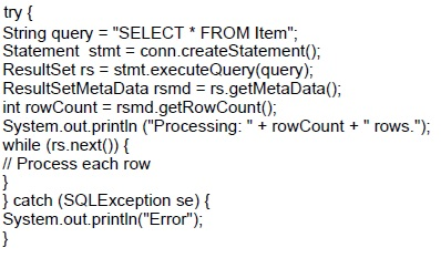 There is no GetRowCount method in java.sql.ResultSetMetaData.The following line will not compile:int rowCount = rsmd.getRowCount();Reference: java.sql.ResultSetMetaData