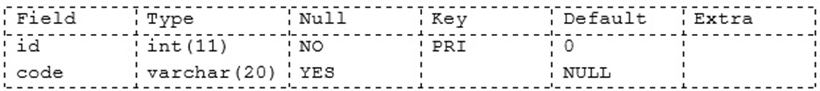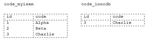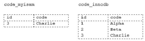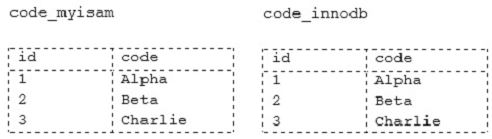 mysql> INSERT  INTO code_innodb VALUES (1, ‘Alpha’), (2, ‘Beta’), (3, ‘charlie,),(4, ‘Delta’);