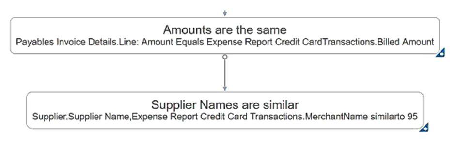 You have built a transaction model to identify possible duplicate charges between invoicing and expense credit cards. The model logic already includes two standard filters that identify amounts and suppliers that are the same or similar, as shown: