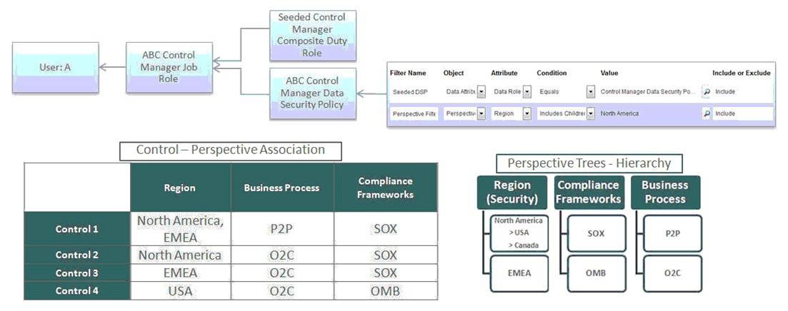 Which controls can user A manage for the following Control Manager role Configuration? See details of perspective trees and control-perspective association below.