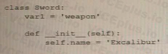 The correct answer is C. Excalibur is the value passed to an instance variable. In the given code snippet, self.name is an instance variable of the Sword class. When an instance of the Sword class is created with varl = Sword('Excalibur'), the value 'Excalibur' is passed as an argument to the __init__ method and assigned to the name instance variable of the varl object.The code defines a class called Sword with an __init__ method that takes one parameter name.When a new instance of the Sword class is created with varl = Sword('Excalibur'), the value of the 'Excalibur' string is passed as an argument to the __init__ method, and assigned to the self.name instance variable of the varl object.Reference:Official Python documentation on Classes:https://docs.python.org/3/tutorial/classes.html