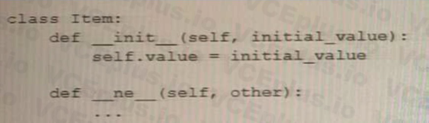 The correct answer is D. The code is responsible for the support of the inequality operator i.e. i != j.In the given code snippet, the __ne__ method is a special method that overrides the behavior of the inequality operator != for instances of the MyClass class. When the inequality operator is used to compare two instances of MyClass, the __ne__ method is called to determine whether the two instances are unequal.