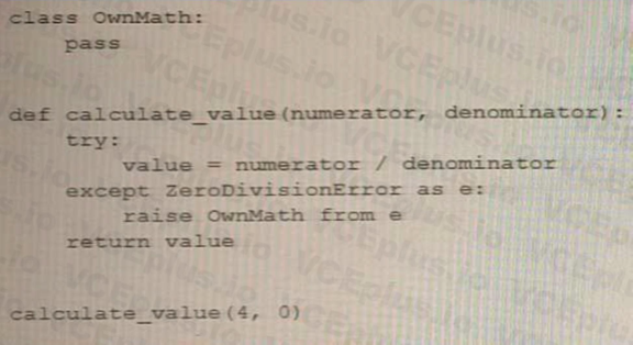 In the given code snippet, an instance of OwnMath exception is raised with an explicitly specified __cause__ attribute that refers to the original exception (ZeroDivisionError). This is an example of explicitly chaining exceptions in Python.