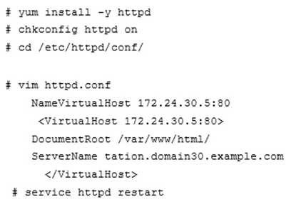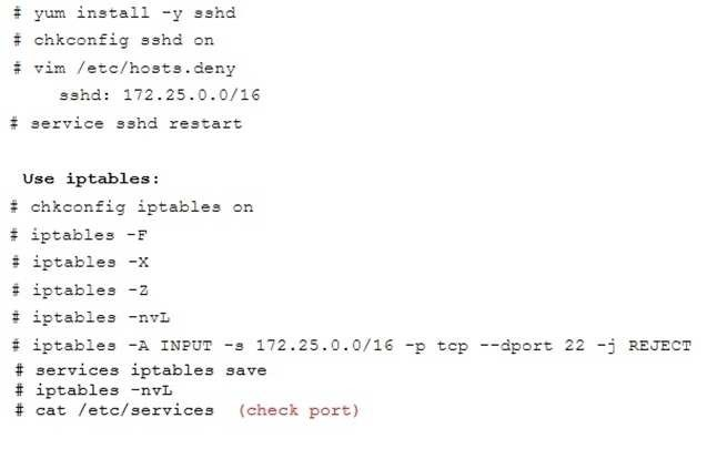 Conclusions: 1. I find that it is common to add various service access limits in the exam RHCE. The exercises like: require one network segment can be accessed another network segments can not be accessed, the following are some conclusions for various service: tcp_wrappers:/etc/hosts.allow,/etc/hosts.deny tcp_wrappers can filter the TCP’s accessing service. TCP whether has the filtering function which depends on this service whether use the function library of tcp_wrappers, or this service whether has the xinetd process of starting function of tcp_wrappers. tcp_wrappers’s main configuration file is /etc/hosts.allow,/etc/ hosts.deny.And the priority of the documents in hosts. allow is higher than hosts. deny. Visit will be passed if no match was found.sshd,vsftpd can use the filtering service of tcp_wrappers. Configuration example: Notice: The two configuration files’ syntax can refer to hosts_access (5) and hosts_options(5) sshd_config There are four parameters in this configuration file: DenyUsers, AllowUsers, DenyGroups, AllowGroups, they are used to limit some users or user groups to proceed Remote Login through the SSH. These parameters’ priority level is DenyUsers->AllowUsers->DenyGroups->AllowGroups Configuration example: httpd Service Through the /etc/httpd/conf/httpd.conf in parameters, can add <Directory> to control the url access. Just as: Notice: So pay attention, deny’s and allow’s priority level in order deny,allow is: the backer has the higher priority level. But here, allow’s priority has a higher priority level. nfs Service nfs service directly control the visits through file /etc/exports, just as: samba Service Parameter hosts allow in /etc/samba/smb.conf which is used as Access Control, just as: 2. Paying attention to use Mount parameters: _netdev,defaults when you are mounting ISCSI disk. 3. Stop the NetworkManager /etc/init.d/NetworkManager stop chkconfig NetworkManager off 4. When you are deploying ifcfg-ethX, add parameters: PEERDNS=no 5. Empty the firewall in RHCSA RHCE、 : 6. Narrow lv steps: 7. Mount the using command - swap which is newly added in /etc/fstab 8. If Verification is not passed when you are installing software, can import public key: rpm import /etc/pki/rpm…/…release and so on. In yum.repo, you also can deploy gpgkey, for example, gpgkey=/etc/pki/rpm…/…release 9. When you are using “Find” command to search and keep these files, paying attention to use cp -a to copy files if you use user name and authority as your searching methods.