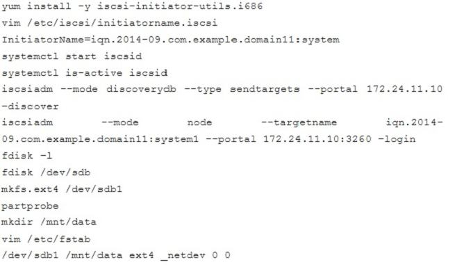 Deploying your exam system: link to the iscsi target in the instructor.example.com and distinguish it well, then format as ext3 file system. You must be able to mount the file system of the iscsi target to the /mnt/iscsi directory in your own system and make this file system can automatically mount (permanently mount) after system restart.