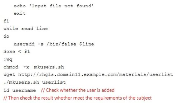 Create a script named /root/mkusers on the system1, this script can achieve to add local users for the system1, and user names of these users are all from a file which contains the usernames list, and meet the following requirements at the same time: