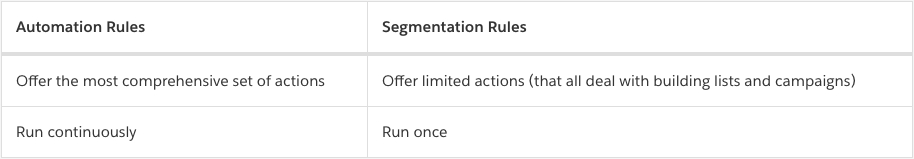 Automation rules and segmentation rules are both types of Marketing Cloud Account Engagement automation that allow you to perform actions based on criteria. However, the main difference between them is that automation rules run continuously and segmentation rules run once. Automation rules are always on and listening for changes or activity, and they can apply actions to prospects that match the criteria now or in the future.Segmentation rules are designed to pull a one-time list of prospects, then apply the set actions, such as adding them to a list or a Salesforce campaign.Once run, segmentation rules have to be copied to run again