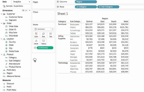 When you add a measure to the view, Tableau automatically aggregates its values. Sum, average, and median are common aggregations; for a complete list, see List of Predefined Aggregations in Tableau.