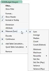 In Tableau, you can aggregate measures or dimensions, though it is more common to aggregate measures. Whenever you add a measure to your view, an aggregation is applied to that measure by default. The type of aggregation applied varies depending on the context of the view.When you add a measure to the view, Tableau automatically aggregates its values. Sum, average, and median are common aggregations; for a complete list, see List of Predefined Aggregations in Tableau.The current aggregation appears as part of the measure's name in the view. For example, Sales becomes SUM(Sales). Every measure has a default aggregation which is set by Tableau when you connect to a data source. You can view or change the default aggregation for a measure---see Set the Default Aggregation for a Measure.You can change the aggregation for a measure in the view from its context menu: