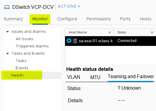 When attempting to perform a health check of the teaming policy, the health status of the Teaming and Failover reports as ' Unknown?, as seen in the exhibit.