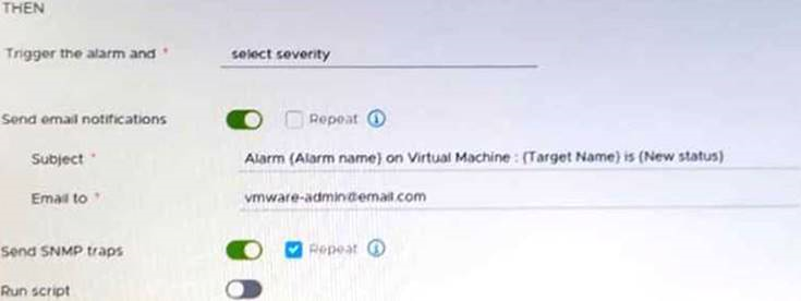Option C is correct because it allows the administrator to configure the mail server settings in the vCenter settings in the vSphere Client, which are required for sending email notifications for alarms. Option A is incorrect because it configures the mail server settings on an ESXi host system, which are not used for sending email notifications for alarms. Option B is incorrect because it configures the alarm rule definitions, which are already enabled in the exhibit. Option D is incorrect because it configures the vCenter Management Interface, which is not used for sending email notifications for alarms. References:https://docs.vmware.com/en/VMware-vSphere/7.0/com.vmware.vsphere.monitoring.doc/GUID-A2A4371A-B88