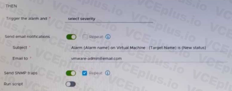 Option C is correct because it allows the administrator to configure the mail server settings in the vCenter settings in the vSphere Client, which are required for sending email notifications for alarms. Option A is incorrect because it configures the mail server settings on an ESXi host system, which are not used for sending email notifications for alarms. Option B is incorrect because it configures the alarm rule definitions, which are already enabled in the exhibit. Option D is incorrect because it configures the vCenter Management Interface, which is not used for sending email notifications for alarms. Reference:https://docs.vmware.com/en/VMwarevSphere/7.0/com.vmware.vsphere.monitoring.doc/GUID-A2A4371A-B888-404C-B23FC422A8C40F54.html